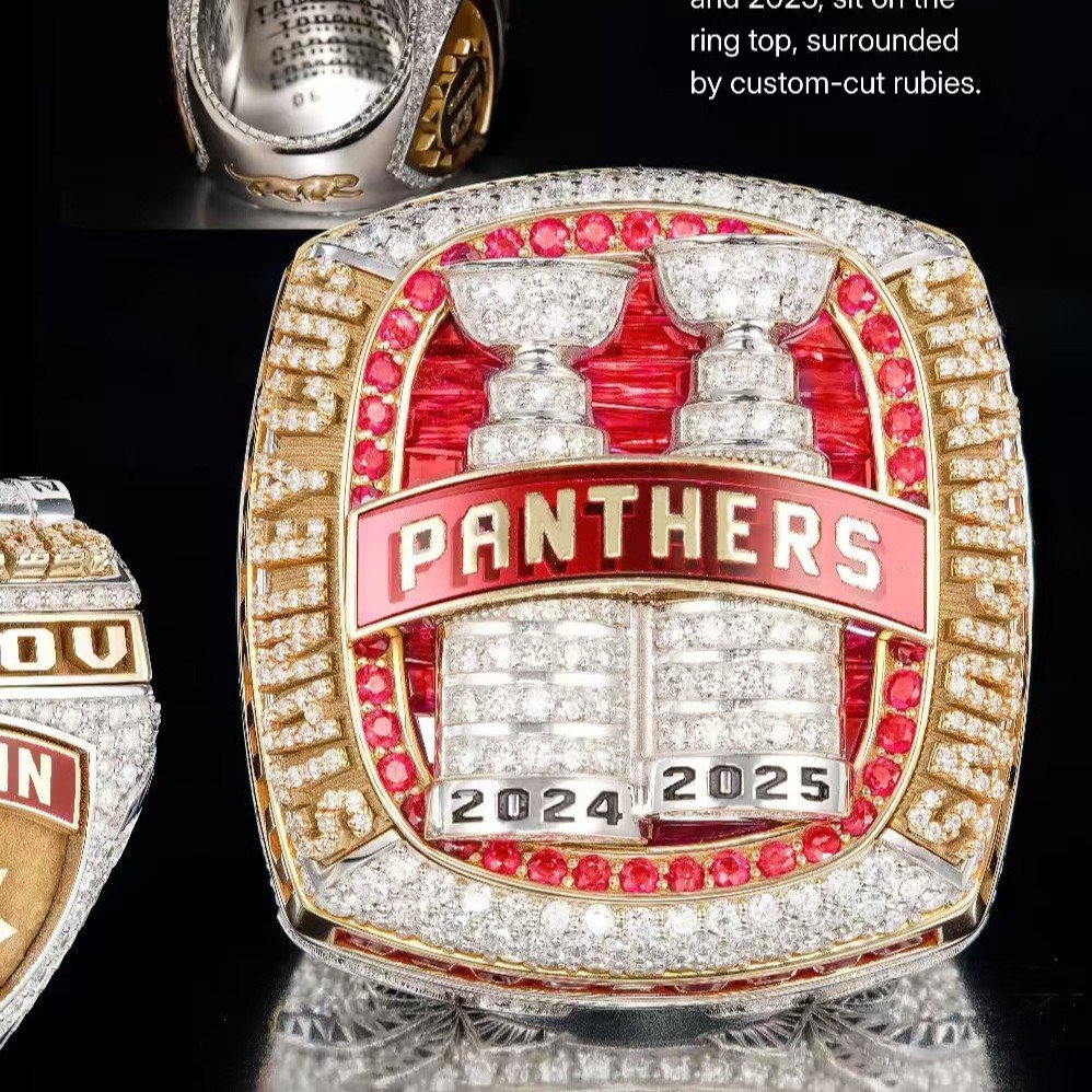Honor the Florida Panthers’ 2024 and 2025 Stanley Cup victories with this stunning replica championship ring — a masterpiece designed for true hockey fans and collectors. Featuring a dual trophy design, detailed engravings, and hundreds of brilliant stones, this ring is a bold tribute to the Panthers’ back-to-back titles.